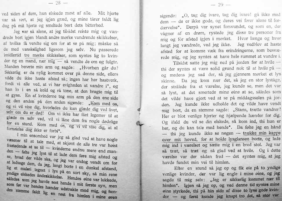 oppløsningen på de avfotograferte sidene er gjort relativt lavoppløslig for at ikke filas samlede størrelse skulle bli for stor. Originalen var av såpass gulnet og utydelig trykk, at ocr-scanning av dette ikke var mulig med de ocr-progr./utstyr som jeg råder over.(RØ) link til annen gammel bok med innhold med mye av det samme som "vandrer..."
