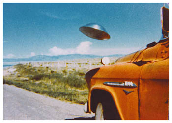 After a long conversation, the space-people re-entered their spaceship and it took off and hovered and maneuvered about the area for some time. At one point it hovered about 300 feet above the pickup truck and Villa saw it rise slowly from the ground to a height of three or four feet and then slowly settle back down again. The spacecraft then flipped up on its edge with the under part rotating, and traveled sidewise up and down at different speeds. The distortion on the leading edge of the craft in photo number 3 is caused by the rotation of the lower half of the ship and the swaying branches of the trees which were put into motion by a big rush of wind.
