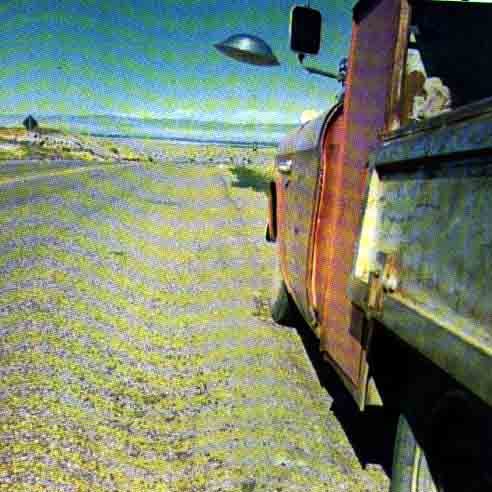 This ship looked to be considerably more than 100 feet in diameter. The big ship slowed and hovered about 500 feet above him. He began snapping pictures. A wind disturbance arose and became so strong that at one point Villa thought his truck might blow over. Then without warning, it stopped suddenly, instantly, just as though someone had turned it off, and the surrounding air got calm and there was dead silence. Then the huge ship extended a telescopic tripod landing gear and settled on it, part of which may be seen in one of the photos.