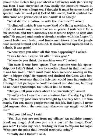 Richard shows that he has pain in the kidney. Then the old man goes back to the spacecraft and float up in the same way as he came down. He returns shortly and then with a cylindrical object that resembles a microphone, about three centimeters in diameter. The man stands behind Richard and bows his head a bit. Then he puts his knee on his back and let the instrument slide down along the spine. That moment Richard feels a force through as rays and kidney pains disappear.