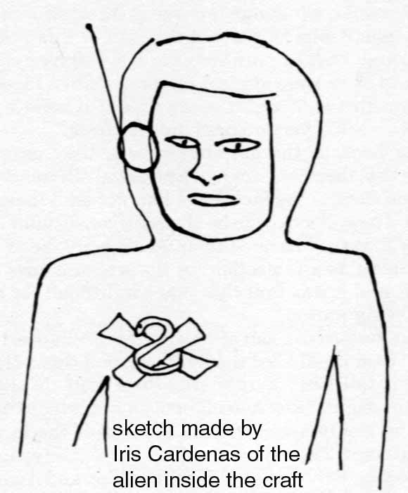 "Iris saw the ship arrive. She took out a cigarette and lighted it, very naturally. I told her I didn't think she should do that because they might not like it. Then she did not know what to do with the cigarette. In comparison I would say that the ship was a little larger than a truck or autobus, though of a very distinct form. We entered (the ship) up a ramp about eight feet long. We could see inside but nevertheless, it gave me the impression, or better, the sensation that my body passed through the body (transparent material, like glass) that was there. It was like I was going to collide with something but passed through It was like a window of crystal, which upon passing through, we felt a distinct atmosphere, almost like we were out of this world! I felt myself floating. I felt like my body did not weigh anything. My thoughts and ideas were of great intensity. When I looked back outside through the 'door,' it seemed as if it were a division between two worlds, very distinct and separate."