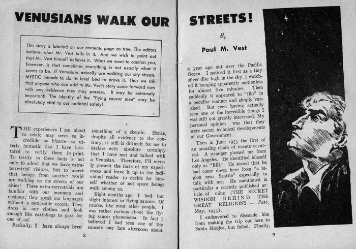 "This story is labeled on our content’s page as true. The editors believe what Mr. Vest tells in it. And we wish to point out that Mr. Vest himself believes it. What. we want to caution you, however, is that sometimes everything is not exactly what it seems to be. If Venusians actually are walking our city streets, MYSTIC (the editor of the magazine writes this) - intends to do its level best to prove it. Thus we ask thet anyone who can add to Mr. Vest's story, come forward now with any evidence they may possess. It may be extremely important! The identity of the "flying saucer men" may be absolutely vital to our national safety!