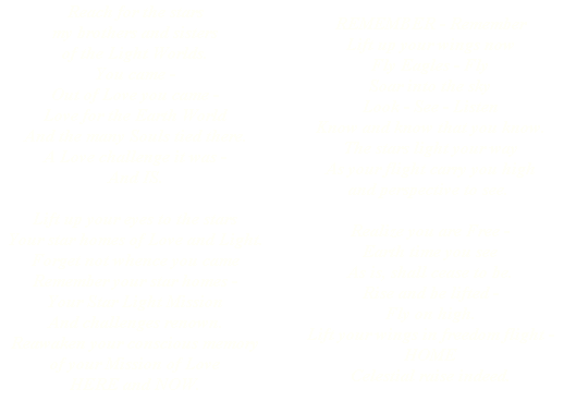 Some "star people" represent the Ashtar Command or other ET groups and civilisations. Everyone is a visitor, living on Earth to perform a mission. As we are approaching the end of the Piscean age, the space commands are increasing their communications and interactions with their incarnated representatives. It has been said that there are at present about 144 000 Lightworkers from the Ashtar Command on Earth. That is the minimum of souls required for the ascension process. They are called "Eagles" within the command. These Eagles are a group of souls who don`t identify with a special planet. They know they are one with all, and that they are Christ (fundamental to any discussion of New Age Christology is the recognition that New Agers distinguish between Jesus, a mere human vessel, and the Christ consciousness (variously defined, but always divine, and often a cosmic, impersonal entity)). These Eagles are incarnated on Earth to guide humanity into the 5th dimension.