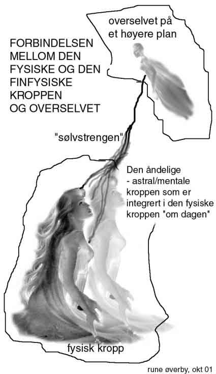det er gjennom den eteriske "livlinjen" kalt SØLVSTRENGEN at overjeget sender livskraft eller besjeler kroppen. Når denne sølvsnoren brister ved døden så etterlates kroppen som "et flatt batteri" - uten strøm. Det er altså sjelen/overjeget som "elektrifiserer" kroppen med "liv". Dette liv er den eterisk-astrale kroppens nærvær i den fysiske kroppen. picture showing the astral body - as the "shadowbody" which is integrated in the physical body under "normal" day- consciousness and the connection to the REAL-LIFE-body - THE OVERSELF - through the etereal lifeline, the SILVERCORD. It is the overself that gives LIFE to the body - that electrifies the coarsebody on earth.