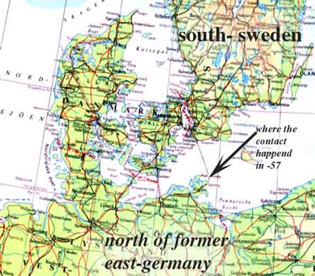 He – then in july-57 was only 15 - lived in the place Glowe, on island Rügen/Baltic coast. He was as often, running to a neighbor village 2km away (Kohsdorf), where he had his own private hiding place with a good outlook to the sea. There he just that day in the summer-57 – scared – saw two BIG color-light-flickering flying rings ca 200m up, which was flying some around where he laid. Panick – he ran, hiding some away. Then, on his way home any later – of fear or something – he lost his consciousness, but some confused, found his way home. He now had a kind of red color on his skin! That evening he was dreaming that he "met" the ET’s of the craft- and they invited him onboard, and they agreed to meet just 23.july!!
