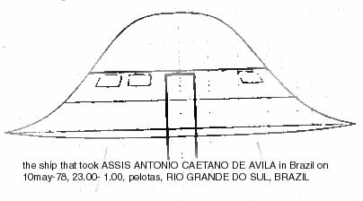 From 2300 to 00:15, some hour and 15 minutes on Wednesday 10 May 1978, young Assis Antonio Caetano de Avilaa, 28 year old bachelor residing at Rua Leopoldo Miguens 632, Vila Santos Dumont, near the Cohab suburb in thecity of Pelotas, Rio Grande do Sul, was abducted aboard a UFO from a field in front of Avenida Cristvao Jose dos Santos in Cohab.