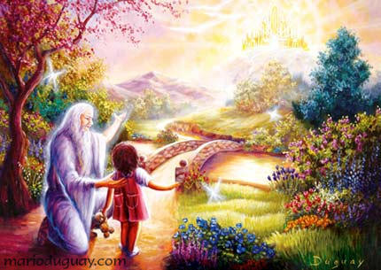 Omsider nådde jeg toppen av den siste fjellkjede, som var mellom meg og den gyldne port, og jeg så ut over et vidunderlig skjønt landskap. Vinden bevegde trærnes løvrike kroner liksom en velkomst til meg. Foran meg lå den skinnende floden, ved hvis bredder det vokste blomster av en skjønnhet og med en duft jeg ikke kan beskrive. Og på den andre siden av floden så jeg den gyllne port. Med en voldsom følelse av glede kastet jeg meg i floden og svømte over til den andre siden. Det friske vann lukket seg over mitt hode, mens jeg dukket og svømte. Min kledning var drivvåt da jeg steg opp på den motsatte bredden, men et øyeblikk etter var den tørr. Jeg så ned på meg selv og ble meget overrasket. Den grå kjortel med de tre hvite kanter bar jeg ikke mer; i stedet for hadde jeg fått en blendende hvit kjortel, med en gylden kant og et gyllent belte. Min sjel ble oppfylt av glede og takknemlighet. Jeg så min kledning: