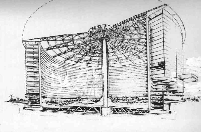 (text for painting-image of Iargan city, page 102-103 in the book) The dwelling units, great covered rings, over 900 feet in diameter by nearly 300 feet high, housed about 10,000 people per unit, and included all services and facilities of all kinds for that many individuals. They were arranged in rectangular formations of 36 ring-complexes per "city" giving a population density of about 6,000 per square kilometer. The strange vegetation has evolved to withstand the heavy gravity and the high winds that prevail here. With only a 10% land surface available on this planet high density living became a necessity and developed efficiently. The strange vegetation has evolved to withstand the heavy gravity and the high winds that prevail here. The fully automated robot rail transport system operated with frictionless efficiency, moving vehicles of many sizes and configurations at high speeds.