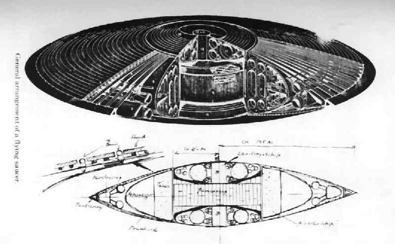 "Suns, due to the rotation of their critical mass, are natural spacecraft which, under the influence of the particle bombardment of their neighbors, navigate space with free cosmic vector powers. Through these powers they maintain their distance from other stars and cause the turning moment and the expansion of galaxies. The sun wheel, therefore, is a copy of the power of a sun. A sun wheel can exert power only in the horizontal plane and one alone can, therefore, not navigate. It is necessary to place a smaller wheel beside the main central wheel, on both sides, that of the landing units, so that a torque can be created in order to steer the ship. When this ring system is covered by metal plating, the discus form appears naturally."