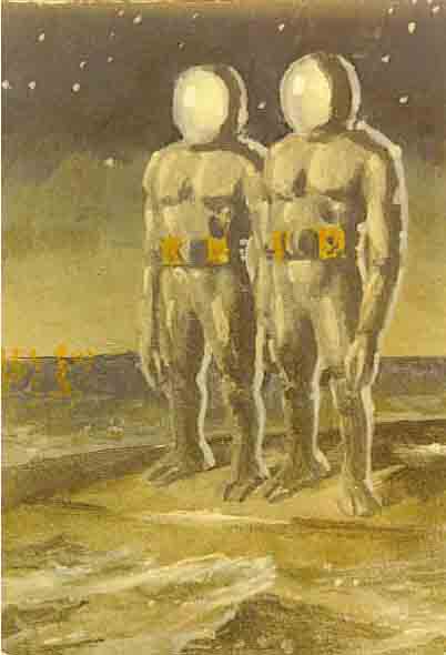 They stood on the platform and, with one hand against their ball-shaped helmets at about the height where their foreheads would be, made slow, respectful bowing movements in my direction. I understood. What a relief. It was a greeting, a friendly, respectful greeting. With quick, short paces they walked to the edge of the platform, where the bowing was repeated and emphasized, and then they stood like statues in the light of my flashlight. A strange and dramatic scene; on the Oosterscheldt a man is confronted with an alien intelligence. But the man was poorly prepared for the meeting; he was nothing more than a sailor in difficulty who could feel his legs trembling in his wet clothes. The two figures in front of me were about five feet tall and from a distance looked deceptively human-arms, head and legs, all in their proper places-but their legs were shorter than ours so that their arms reached down to their knees. Their metallic costumes were smooth and seamless. Only by the shoulders and elbows were folds to be seen. The short, heavy legs ended in broad feet that also stuck out behind, and the front part of their footwear was split in the middle. The hands were covered by supple, ribbed gloves; these were different from ours too in that not only the thumb but also the second finger was enclosed. They were heavy, clawlike hands.