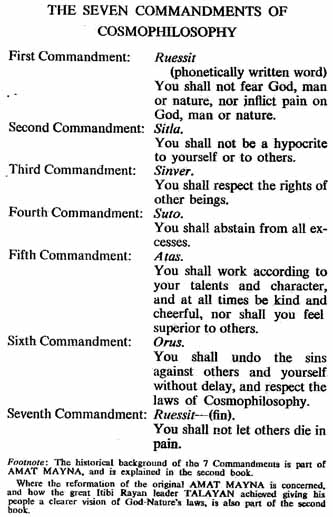 Once in the far past they had also been primitive and meat-eaters. Then came "Talayan" (similar to the Indian word 'mathama') - the greatest religious reformer of their planet, and he gave them THE SEVEN COSMIC COMMANDMENTS - se more on this later.