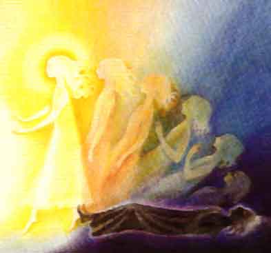 DØDEN - Å SKIFTE TIL ET ANNET OPPLEVELSESLEGEME "...den naturlige dødsprosessen er noe annerledes (i forh.til ulykker etc) - da det normalt går lang tid før LIVET trekker seg ut av kroppen og den dør. I denne tid får sjelen (altså den åndelige struktur i vesenet) god tid til å forberede seg på dette - slik at overgangen ikke blir sjokkartet. Mange opplever jo sykeleier over mange år. Umiddelbart før sjelens tilbaketrekning spilles hele livets hendelser opp som en revy i rask rekkefølge - men da dette ikke er underkastet "fysisk" tid så vil denne revy inkludere utrolige detaljer som man forlengst har glemt. Sjelen vurderer nå alt ut fra en annen synsvinkel enn den gjorde før - der den uselviske kjærligheten i handlingene blir vurdert. Slik blir sjelen selv dommer over hva den som menneske har tenkt og gjort. Det får her muligheten igjen å kunne tilgi det som før ble opplevd som urettferdighet Dersom mennesket har forberedt seg på sin død, kan sjelen relativt lett frigjøre seg fra kroppen. Til dette får den også hjelp fra sin personlige skytsengel og andre åndelige vesener som har til oppgave å yte en slik hjelp. Disse tar imot den nyankomne sjel og "ønsker den velkommen". Men disse hjelpevesener presser seg aldri på med sin hjelp, og om de avvises så trekker de seg bort. Om et menneske ikke har forberedt seg på sin død og om dette har levd et liv kun fokusert og innrettet mot det materielle - og avvist alle åndelige tanker - vil det fortsette med dette også etter sin død. Ja - da det opplever at det lever videre "etter sin død", vil det avvise at det ER død - og avviser også hjelp fra disse hjelpende vesener som vil lede det videre, ettersom disse respekterer den frie viljen. Følgende historie belyser dette - her i dansk språk fra boken DEN EVIGE TILVÆRELSE av Oscar Bush (strubes forlag -73, visstnok gjenopptrykket under tittelen "sjelens lange reise mellom himmel og jord" på skt.ansgers forlag i dk - boken er fremragende på dette med livet på den andre siden. R.Ø.anm.) : "…svært mange har efter deres død - den forestilling, at de endnu lever på jorden. Det er ofte tilfældet for dem, som i hele deres livsanskuelse er meget jord-bundne, i særdeleshed dersom de er blevet kaldt hastigt bort, hvis de er faldet i krig, druknet ved et skibsforlis eller lignende. Adelma von Vay (En østrigsk baronesse, som selv er et udmærket medium og gennem flere værdifulde arbejder har beriget den spiritistiske literatur.) - beretter i "Studien über die Geistenvelt" hvor-ledes en officer, kaptajn A., som faldt i krigen i 1866, endnu flere måneder efter sin død ikke var fuldt bevidst om sin forandring. Hun ned-skrev selv en meddelelse fra ham. Han var kommet, sagde han, for at træffe sin gamle ven og krigskammerat, kaptajn K., som på den tid gæstede baronesse von Vay. For ham berettede han, at han blev såret ved træfningen ved Nachod og siden faldt i en slags dvale. Men, da han kom til bevidsthed igen, opsøgte han sine kammerater, styrtede sig ind i den værste kamptummel og "slog Preusserne eftertrykkeligt", mærk-værdigt nok uden at et hår krummedes på hans hoved. Siden rejste han til sit hjem, kørte først med tog, derefter i vogn og det sidste korte stykke gik han til fods. Men hjemme var der ingen, som kendte ham igen, ja, han fandt til sin forbavselse, at han måtte være blevet usynlig og grublede meget derover. Nu havde han opsøgt sin ven K., som han vidste var spiritist, for at spørge om han kunne forklare dette. Han udtrykte også sin forbavselse over, at baronesse von Vay "sad og førte protokol over alt, hvad han sagde". (I virkeligheden gik det sådan til, at A.'s skyts-ånd førte mediets hånd og på denne måde gengav hans tanker). Han erkendte, at han næppe havde nogen krop, ja, at han var blevet så tynd, at han kunne gå igennem den mindste dørsprække. Og dog ejede han en krop, han følte sult (han var i jordelivet en stor gourmand) og syntes, det var trist, at han ikke kunne spise så meget som før. En cigar måtte han dog have, og så ville han passiare, for det havde altid været hans største fornøjelse.