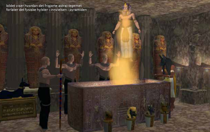 bildet her er en tenkt innvielse for en kvinnelig tempelprestinne der astralkroppen blir frigjort fra den fysiske "grov-kroppen" og gradvis fortettes på sin egen vibrasjon eller frekvens der den er "fast" og like virkelig som den på vibr.planet under (eller "vårt" plan). Gjennom dette erfarer personen at "livet her" ikke er det VIRKELIGE LIV!!