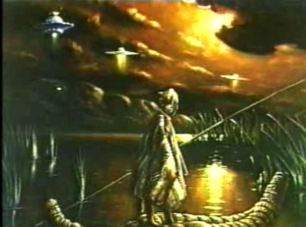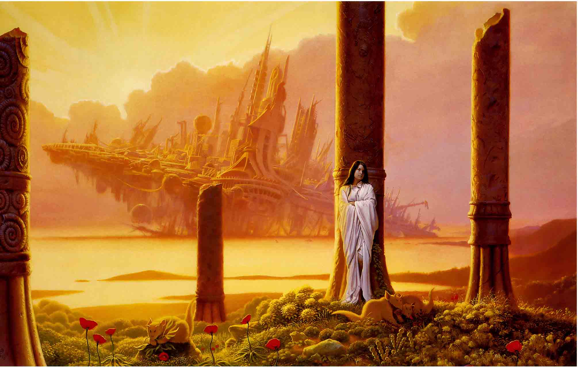 Plötsligt insåg han varför människorna tysta grupperade sig i led. De vandrade bort mot en platå på andra sidan av bergstoppen. Han hade varit så upptagen av att njuta av den svagt parfymerade doften från guldhåret och lyssna till de små viskande berättelse från hennes vardagsliv, att han inte tittat uppåt på en lång stund. Mot himlens ljusnande bakgrund avtecknade sig en armada av luftskepp. Det var vimanor, de flygande underverken som han hittills trott bara fanns i faderns fantasi. Han kände bara till de små trådlösa farkoster som förflyttade människor mellan de olika delarna av Kaiphun. Det fanns också större maskiner som tog atlantiderna över hela kontinenten, men det här var något annat. Hans pojkhjärta höll på att sprängas av spänning.
