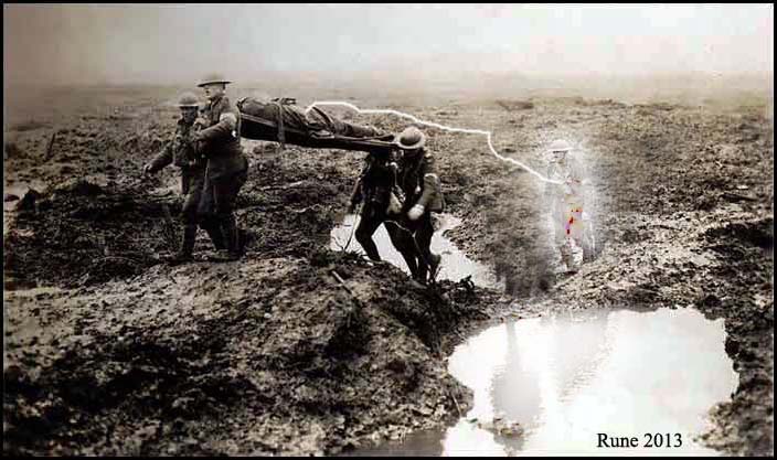 "Vi efterlod George og Fred (avdøde engelske soldater som gruppen etter lang tid klarte å overbevise at de var døde på det fysisk-jordiske planet) - i en sergents varetægt og bevægede os ind i tågen igen. Vi nåede ikke særlig langt, før vi stødte på nogle fra vores gruppe (som også altså arbeidet med å oppspore forvirrede avdøde soldater på slagmarken). De havde også haft held med sig. Jeg vendte mig mod Harry og sagde: "Det var noget af en chance, du tog ved at lade dig skyde."
