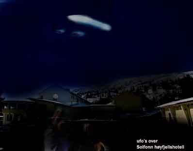 Inn og ut av dette svirrer det mindre lysende kuler , de farer rundt som ildkuler. Det hele var visst svært så spektakulært. Snart står alle hotellgjestene og ser på dette. Den ene av politimestrene tar telefonen og ringer "noen" Etter en stund blir han satt over til noen som vet hva det går i , og får beskjed på at de også følger med på hva som skjer, men at de kan ta det helt med ro forde er helt trygge . Det er ingen agressivitet i fenomenet. Det hele varer faktisk ganske lenge før både kulene og sigar- ufoen forsvinner som en lysstrek på himmelen.Den karen som fortalte meg historien er selv skeptisk og tror ikke på det før han ser det selv, selvom kildene er pålitelige . Det hører også med til historien at fruene til disse herrene begge måtte ha hjelp av psykolog i ettertid.Denne historien er ikke enestående ,men det som gjør den spesiell er at for mange år siden kom det en arbeidskolega bort til meg og ville fortelle om noe som hendte ham.Det var da de bygget flyplassen på Karmøy. Han blir vekket midt på natten av en ren innskytelse. Han og broren sover på samme rom , men det er bare han som våkner. Han går bort til vinduet og kikker ut (mot flyplassen) og ser en mengde lys på himmelen. Han tror først det er helikoptre, men det virker litt ulogisk , så han forstår ikke hva han ser.Da legger han plutselig merke til at dette " lysgreiene " kommer mot huset.Han går bort til brorens seng for å vekke han . Men han lar seg ikke vekke . Det hele ender med at han sleper broren bort til vinduet ,og henger han halveis ut av vinduskarmen . Broren våkner fremdeles ikke . Min arbeidkolega hiver seg da i klærene og løper ut av huset og stiller seg på gårdsplassen utenfor.