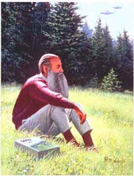 Det dröjde heller inte länge, förrän ett silverglänsande föremål sköt ner från himmelen. Det utgjordes av en enligt mina begrepp fortfarande komisk skapelse av metall; den var inte större än fem eller sex meter i diameter, och den ingav mig redan förtroende. Den päronformade flygande anordningen placerade sig på marken, inte långt ifrån mig, medan jag stirrade fascinerat på den. Jag kunde nu se, hur någonting rörde sig på sidan av föremålet. Där bildades en öppning, och ut i det fria trädde en gestalt. Det var tydligen en mycket gammal man, som var iförd en lustig dräkt. Han kom nu långsamt emot mig, på samma sätt, som när jag såg honom första gången, ett par år tidigare. Också denna gång hade han på sig en slags "djuphavsdykaredräkt", fastän helt silverglänsande, och hjälmen hade han tagit av sig. Trots denna kostymering tyckte jag, att hans utseende var klokt och mycket ärevördigt, och jag kan fortfarande minnas att han precis liknade en gammal högvördig patriark.